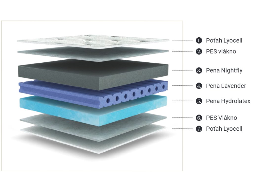 - Jadro matraca: perforovaný Hydrolatex, Levanduľová pena, Pena Nightfly
