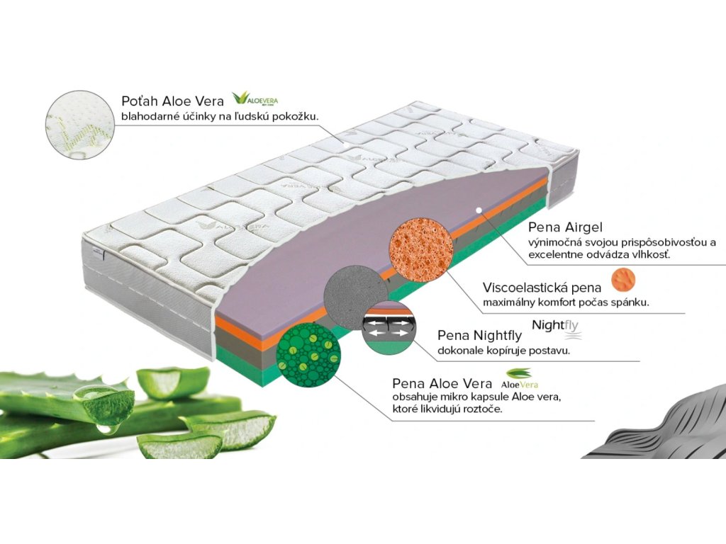 Pena Aloe Vera: inovatívny materiál s pridanou hodnotou v podobe výťažkov z rastliny ALOE VERA. Pena ALOE VERA je výsledkom skĺbenia najnovších technologických poznatkov a dávno známich prírodných liečebných postupov. Tento materiál ponúka vysoký komfort spania a prirodzené detoxikačné vlastnosti zároveň. Veľmi vhodné zapracovanie peny ALOE VERA do novo vyvinutých matracov, je zárukou stabilných úžitkových vlastností, elasticity a príjemného komfortu. Ďalším benefitom týchto matracov je veľmi decentná arómaterapia.