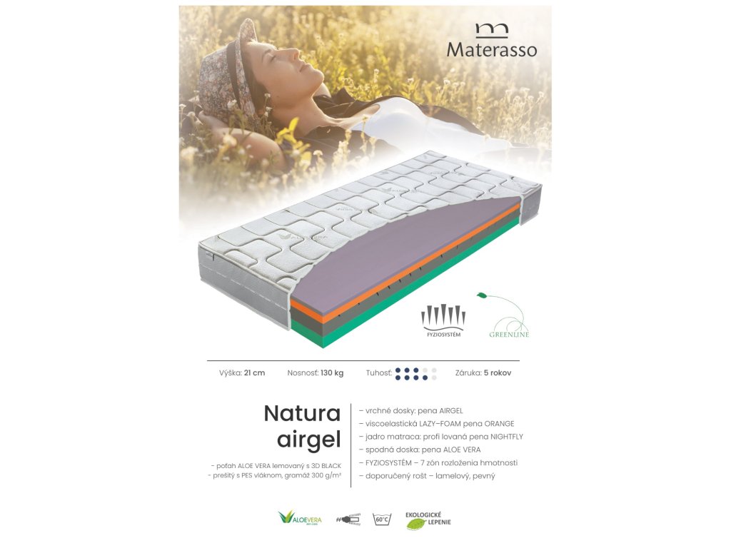 Pena Airgel: Pena výnimočná svojou prispôsobivosťou a veľkou štruktúrou buniek. Pre svoju vzdušnosť sa používa ako vrchná vrstva matraca, pretože excelentne odvádza vlhkosť a udržuje suchú klímu v matraci. Vďaka tejto pene je matrac Natura Airgel vhodný pre ľudí, trpiacich nadmerným potením.