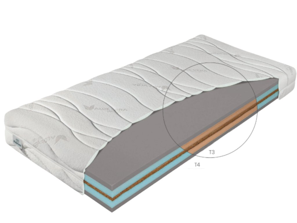 Matracový poťah ALOE-VERA: poťahová látka s výťažkami z tejto rastliny obsahuje prevažne enzýmy, minerálne látky a aminokyseliny, ktoré veľmi pozitívne pôsobia na pokožku a posilňujú relaxačné účinky spánku. Pranie do 60 °C.