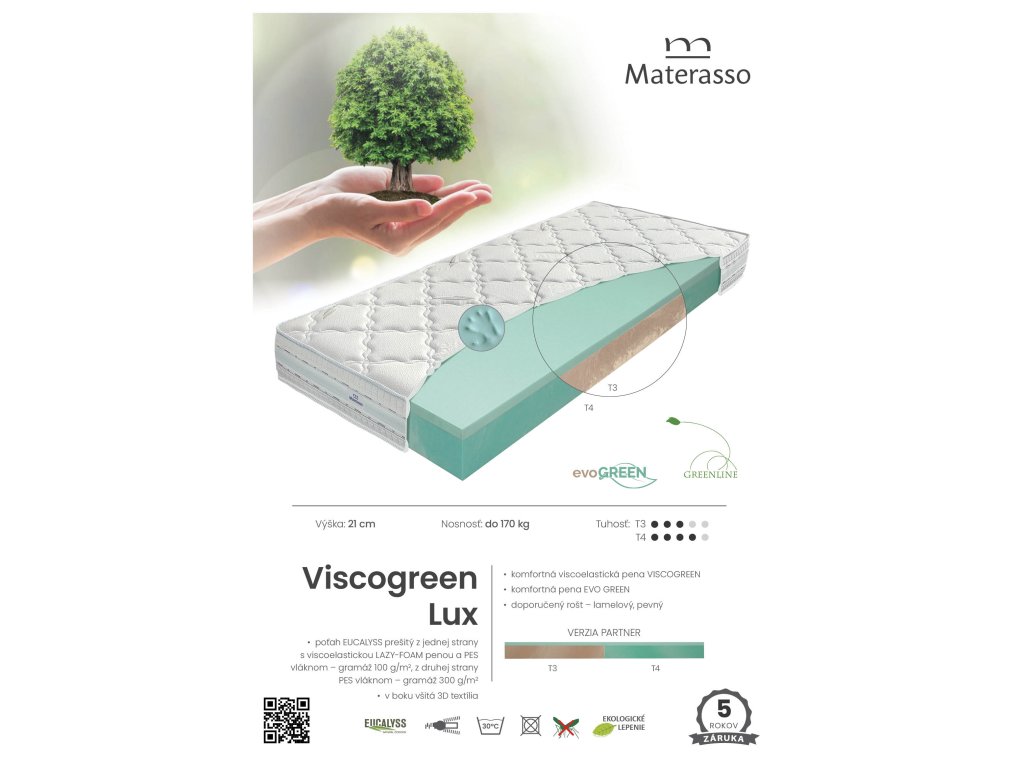 Pena VISCOGREEN (pamäťová pena): 4 cm peny Viscogreen, ktorá je typom lenivej peny, vyrobenej z prírodného ricínového oleja. V porovnaní s viscoelastickou-lenivou penou je komfortnejšia a šetrnejšia k životnému prostrediu. VISCOGREEN svojou jedinečnou tvarovou pamäťou lepšie reaguje na zmeny teploty a tlaku a tým sa rýchlejšie prispôsobuje zmenám polohy tela počas spánku. Má výborné regeneračné a antibakteriálne vlastnosti.