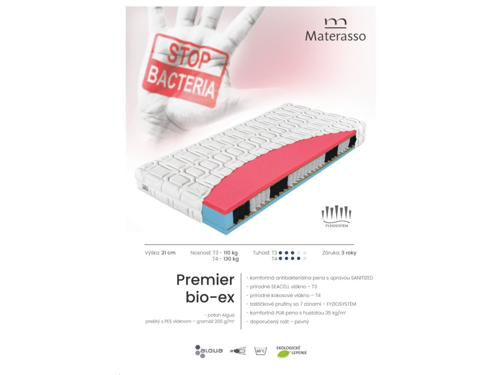 Premier bio-ex je cenovo dostupný matrac s taštičkovým jadrom a PUR penou. V tvrdšom prevedení je roznášacia vrstva kokosové vlákno, v mäkšej verzii túto vrstvu nahrádza vlákno SEACELL / vlákno z rastliny AGAVE.