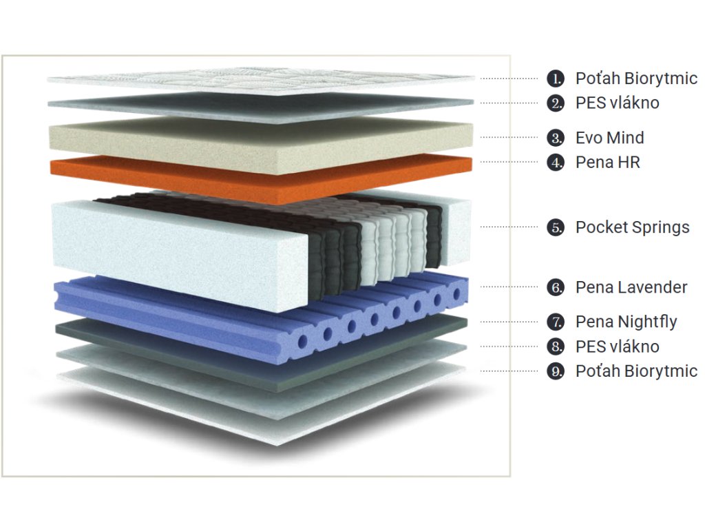 Materiál: | HR pena, Nightfly pena, Levanduľová pena, Taštičková pružina, Mindfoam |