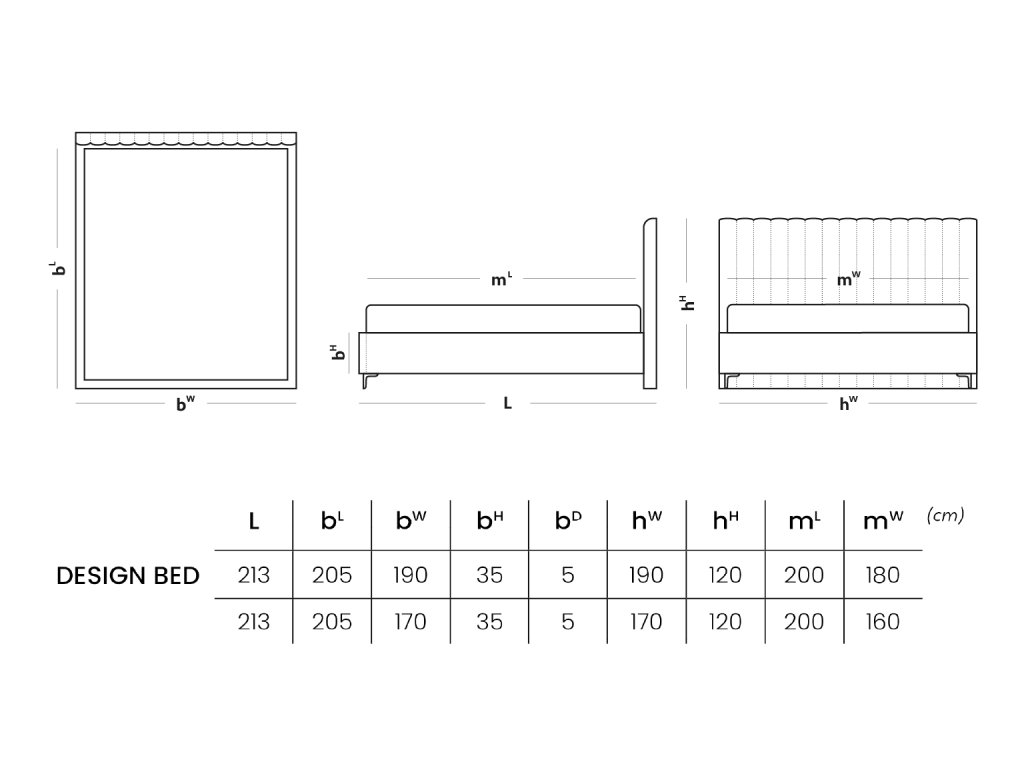 - Celkový rozmer postele: dĺžka 213 cm x šírka 210/190/170 cm alebo 216/196/176 cm podľa zvolených rozmerov a hrúbky bočníc.