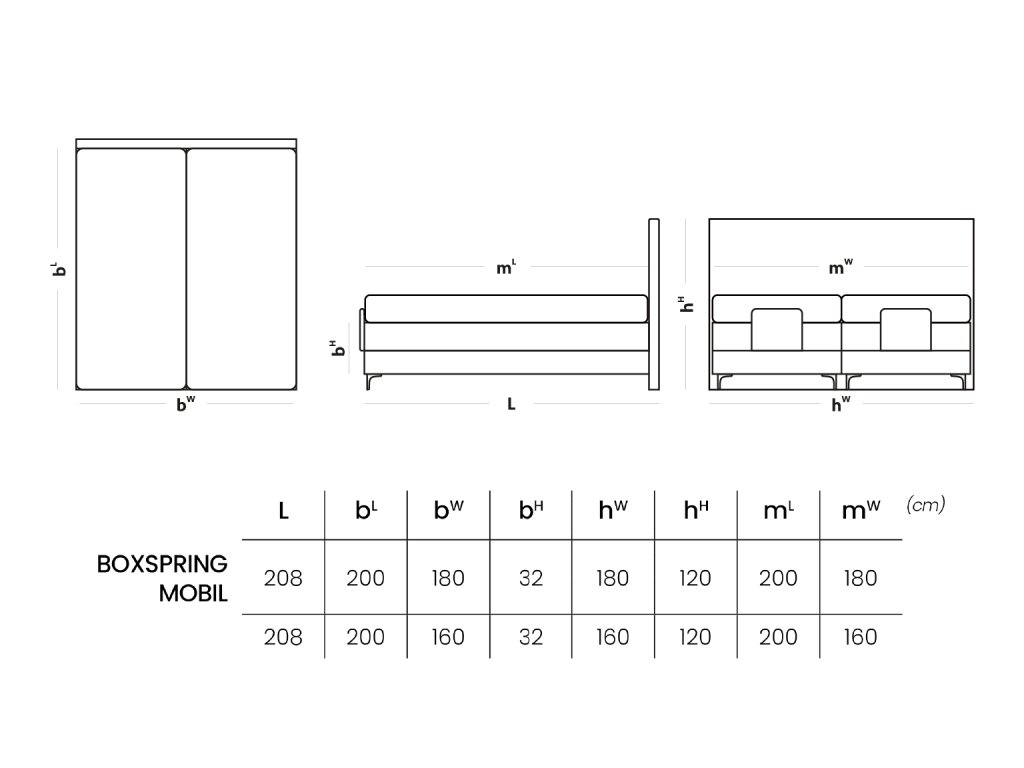 - Výška boxpring / prevedenie boxpring Mobil / výška boxpringu bez nožičiek: 32 cm